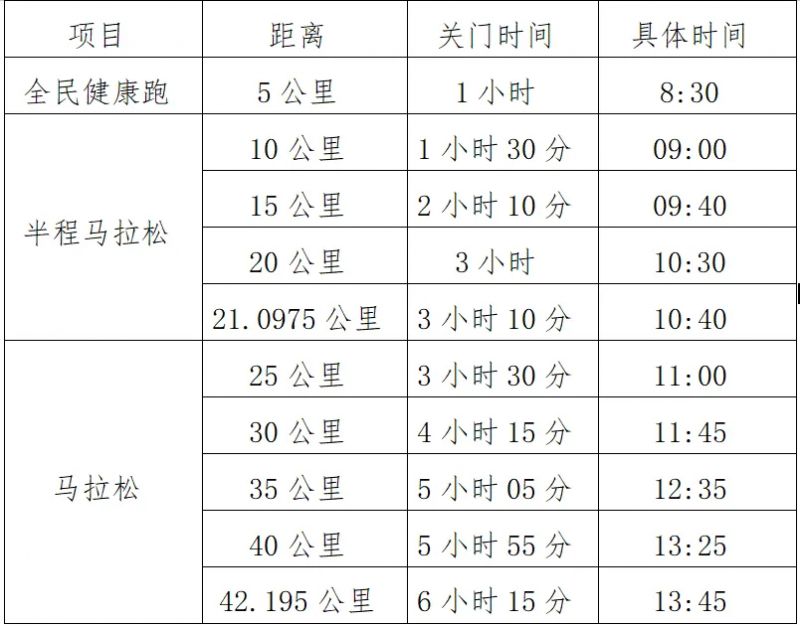 为保证参赛选手比赛安全和城市道路交通秩序,赛道将按公里点位置设置分段关门时间,分路段、分时对社会交通进行临时管制。到达关门时间后,相应公里点的计时毯停止工作,相应赛道将解除交通管制并恢复正常交通,参赛选手应及时停止比赛退出赛道,等候组委会援助车或乘坐公共交通车辆抵达终点。否则由此引发的事故将由该名选手自行承担相应法律责任和赔偿责任。