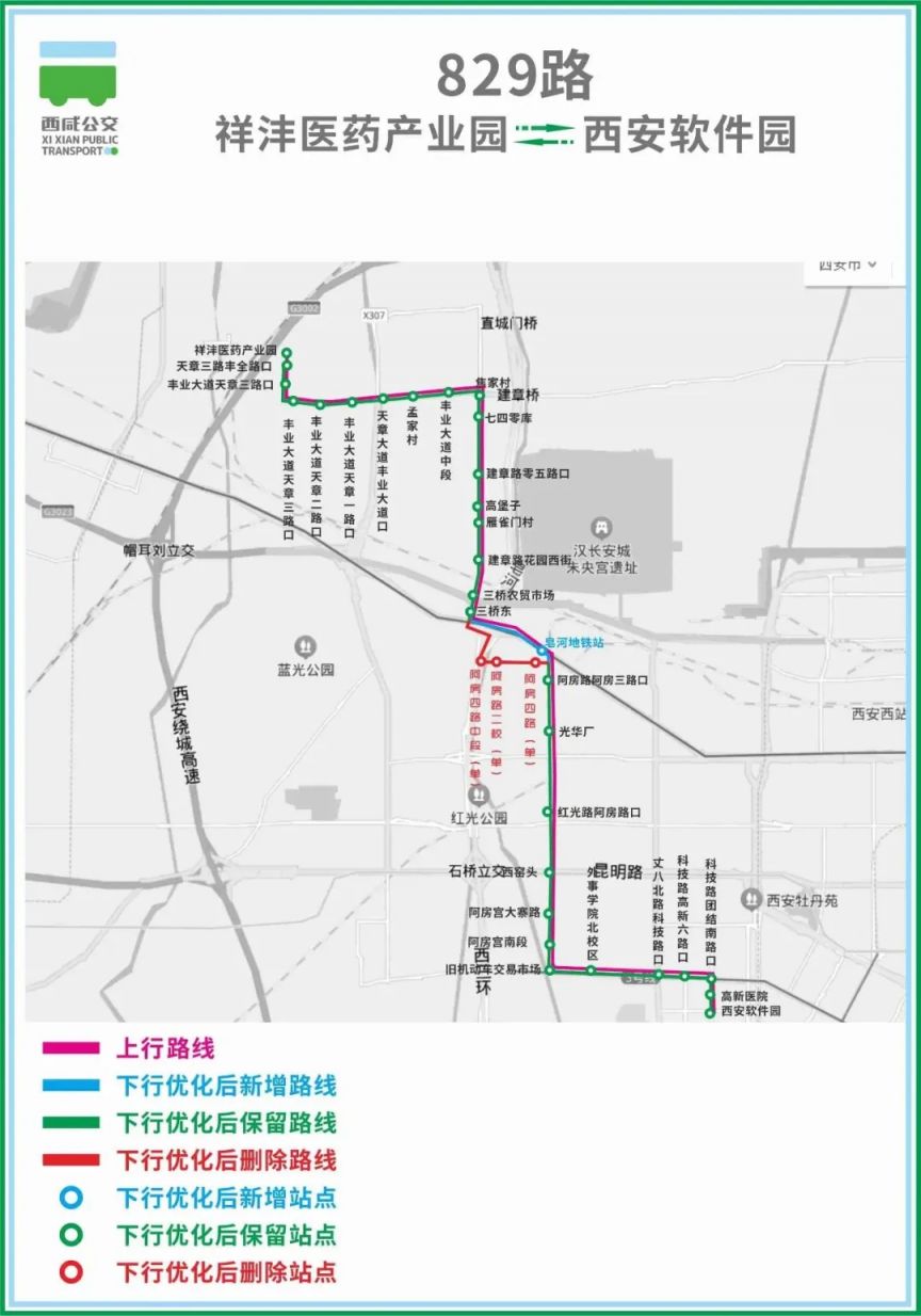 829路“西安软件园-祥沣医药产业园”方向,在“阿房路·阿房三路”停靠后,将向北行驶至枣园西路后沿原线路行驶,不再途经阿房四路。