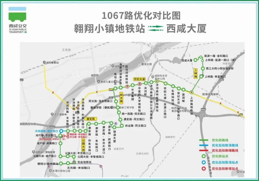 1067路“咸户路·开元路口”至“沣润西路·丰信路口”站点间的走向,由咸户路-沣润西路,调整至咸户路-开元路-丰信路-沣润西路,其他线路走向不变。