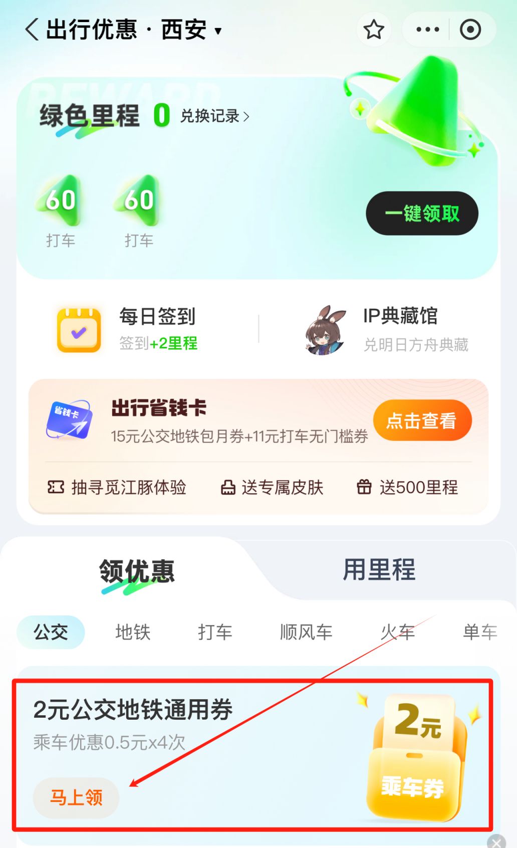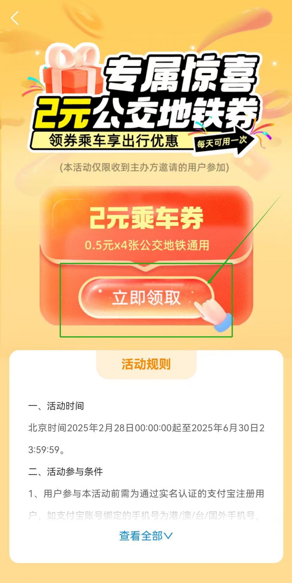 活动参与方式:活动期间用户通过指定链接进入活动页面,点击【立即领取】,即可获得4笔0.5元公交地铁乘车优惠券权益1份限量250000份,数量有限,先到先得,领完即止。