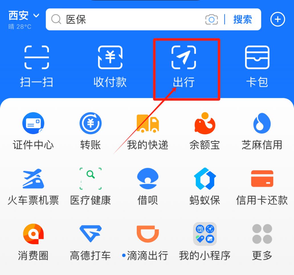 第一步,下载并打开支付宝APP,点击首页的“出行”;