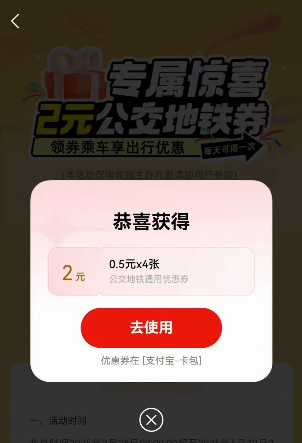 优惠券查看路径:用户所获得的权益将以优惠券形式发放至“支付宝”“卡包”内,支付时自动抵扣,具体可用城市及乘车码范围、使用规则及有效期、使用记录等信息详见卡包中券面详细说明。