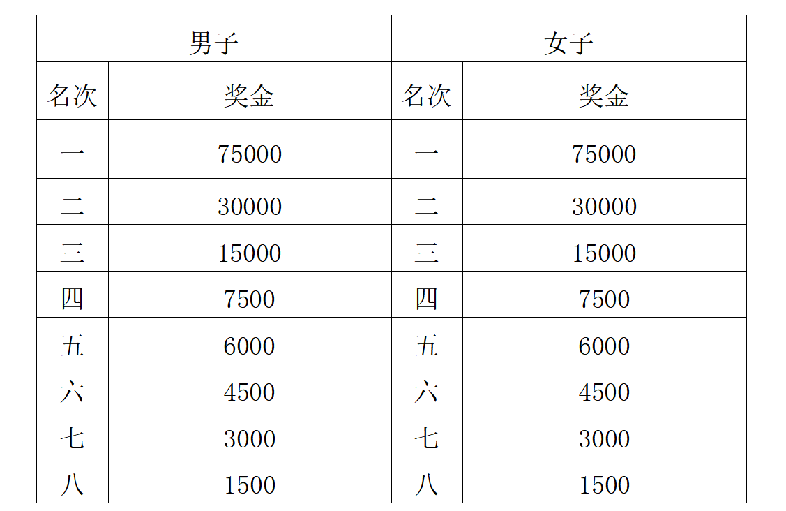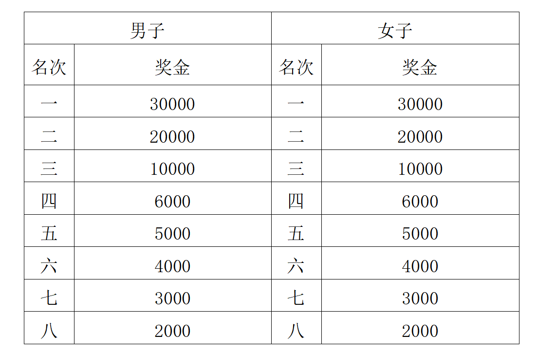 (2)亚军及以下奖励:男子第2-10名,女子第2-10名,分别获得1万元、8000元、6000元、5000元、4000元、3000元、2000元人民币