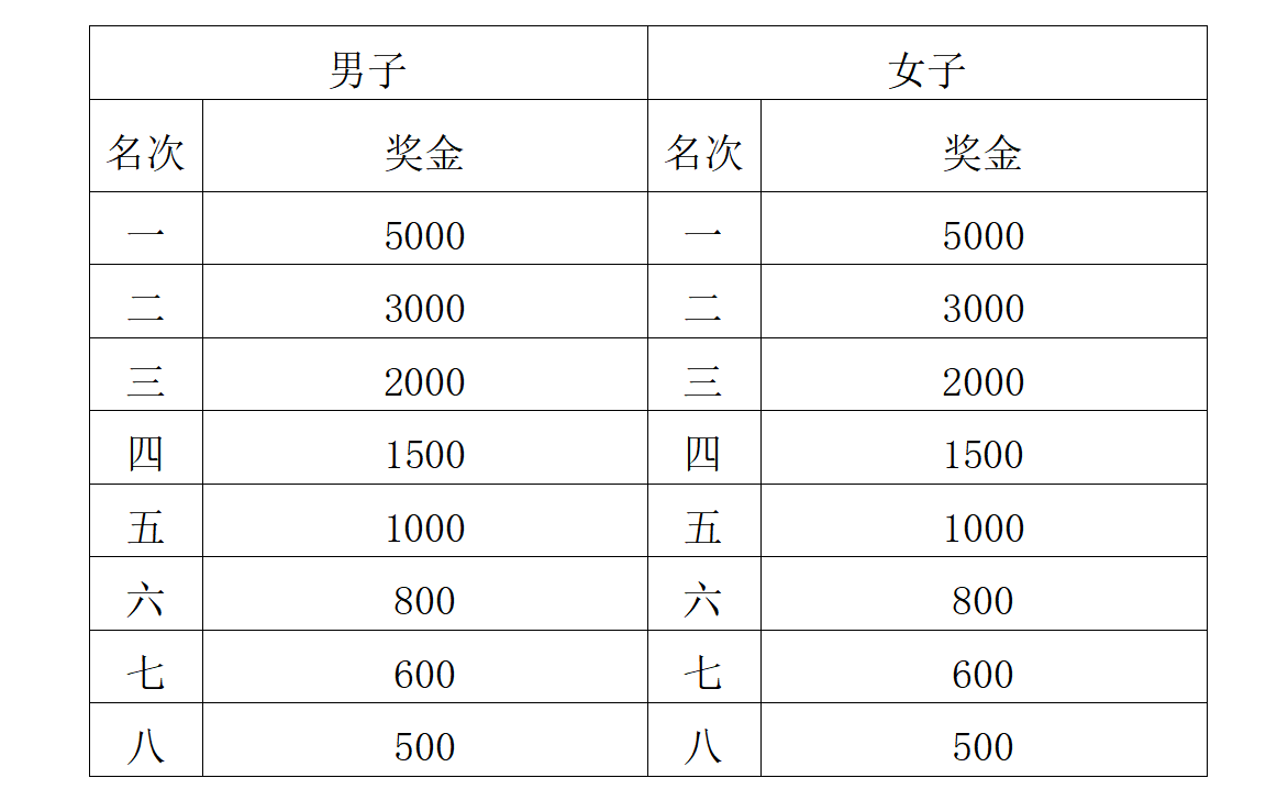 (2)男女第4-10名:分别获得1000元、800元、600元、400元、300元、200元、100