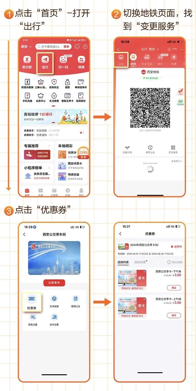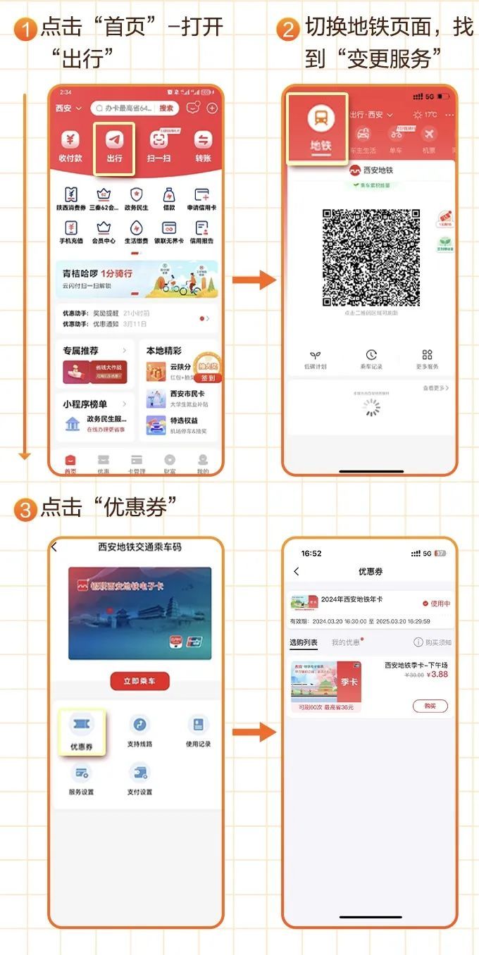 2. "线下购买": - 前往西安地铁车站内的自动售票机或客服中心。 - 选择“购买月卡”选项。 - 按照屏幕提示操作,选择月卡类型。 - 使用现金或银行卡支付。 - 获取实体月卡。