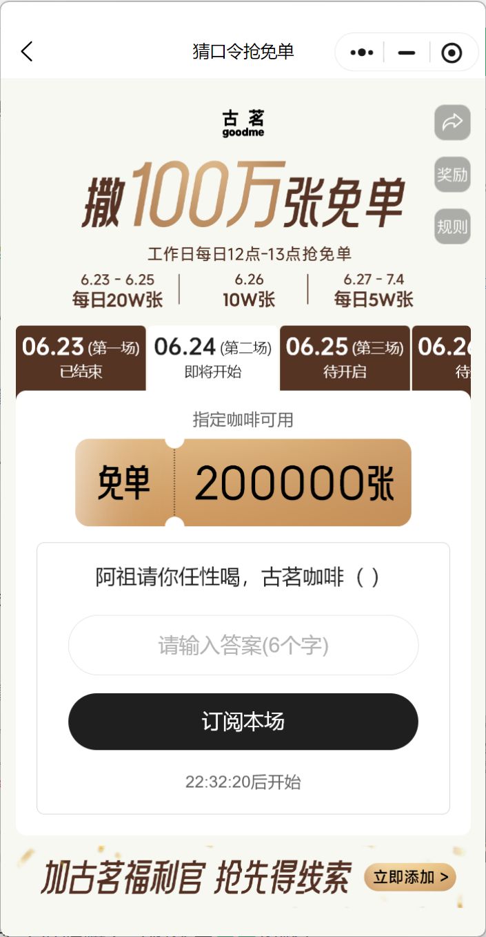 古茗猜口令赢百万免单券活动详情如下: