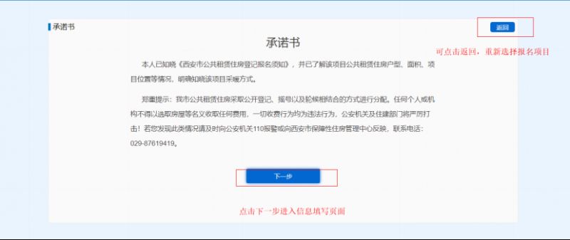 第七步:进入承诺书页面点击【下一步】,或点击【返回】,可重新选择报名项目,如图。