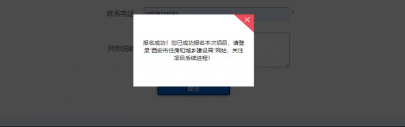 第九步:页面会给予报名成功提示,且会发送短信至报名人手机。短信内容为:“【西安市住房和城乡建设局】您好!您已成功报名XXX项目,请登录“西安市住房和城乡建设局”网站,关注项目后续进程。”,如图。