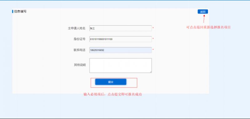 第八步:进入信息填写页面,输入姓名、身份证号、联系电话(必填项)、其他说明(选择性填写),点击【提交】即可报名成功。也可点击【返回】重新选择报名项目,如图。