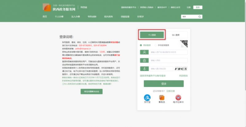 第二步:点击“个人统一认证登录”,进入陕西省政务服务网,选择“个人登录”,如下。