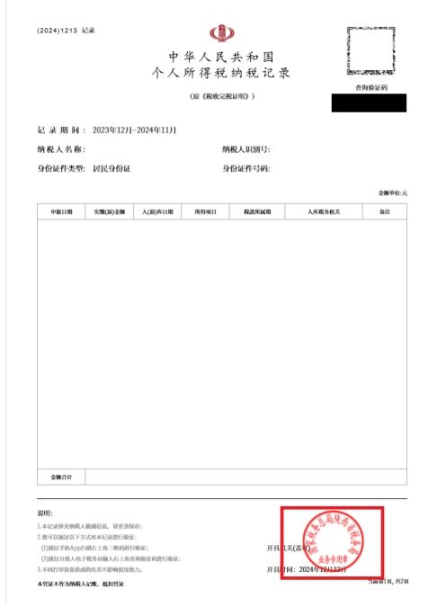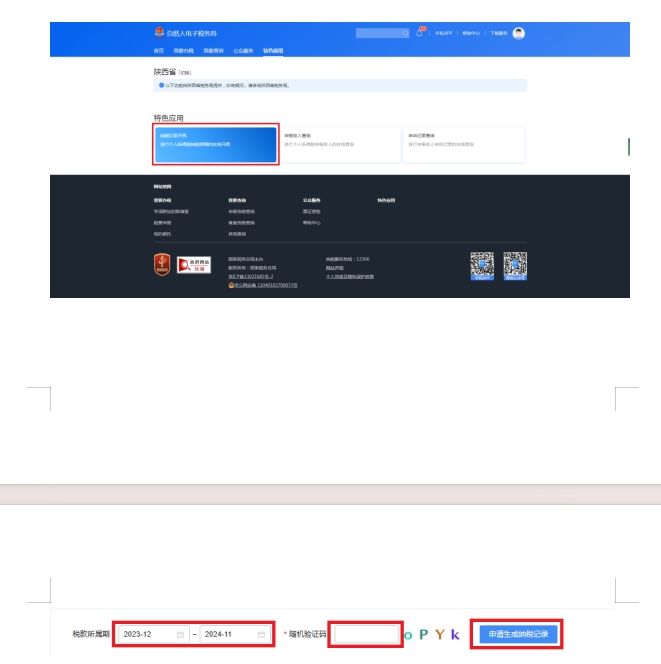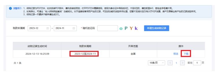 点击“纳税记录开具”。进入页面选择开具年月为2023年12月-2024年11月,输入图形验证码,点击申请生成纳税记录。