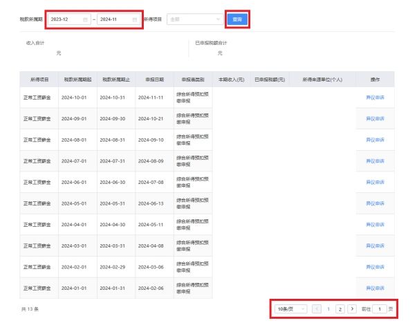 点击申报收入查询,进入页面后选择税款所属期为:2023年12月-2024年11月点击查询后截图打印网页为页码2(注:若收入明细存在多页,需逐页打印)。